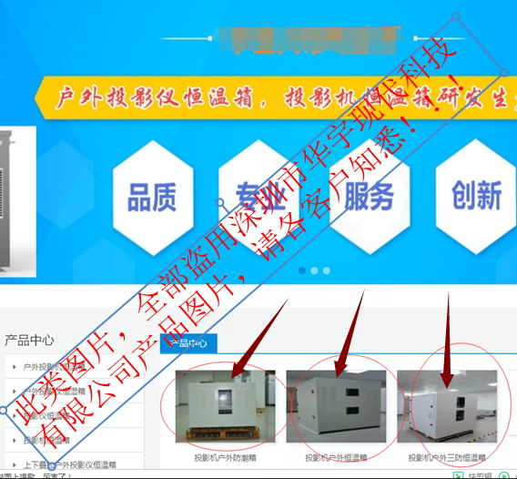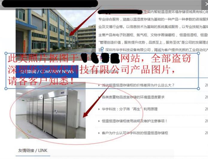 深圳市華宇現(xiàn)代科技有限公司擁有一項(xiàng)恒溫恒濕存儲(chǔ)柜國(guó)家發(fā)明專(zhuān)利,和多項(xiàng)相關(guān)的結(jié)構(gòu)新型及軟著專(zhuān)利。產(chǎn)品廣泛用于外資企業(yè),大企業(yè),企業(yè)集團(tuán),軍工,醫(yī)藥,博物館,檔案館。最近發(fā)現(xiàn)市面有很多貿(mào)易公司或五金生產(chǎn)廠家,在線(xiàn)下或網(wǎng)絡(luò)上盜用我司的產(chǎn)品資料及圖片進(jìn)行不良銷(xiāo)售活動(dòng)。更有甚者以華宇現(xiàn)代的品牌私下接單,但實(shí)際銷(xiāo)售的產(chǎn)品卻是不具備恒溫恒濕功能的非我司產(chǎn)品?。ɡ绾蜕钲谑腥A宇現(xiàn)代科技有限公司相似名稱(chēng)來(lái)取名以混淆客戶(hù),更有甚者,其網(wǎng)上全部圖片盜用華宇現(xiàn)代產(chǎn)品圖片,以蒙騙客戶(hù)(可以進(jìn)入華宇現(xiàn)代官網(wǎng)www.laiyunhe.com比較即知))